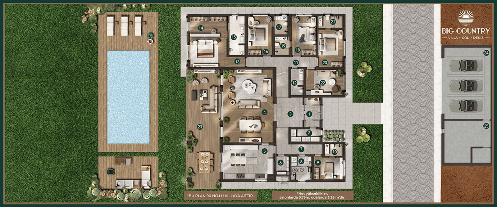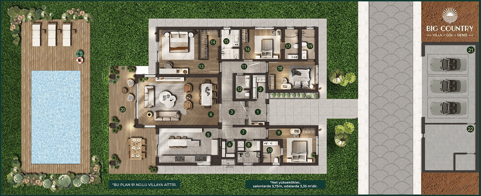 Big Country’de tek katlı, çok huzurlu bir sosyal hayat da sizi bekliyor. Geniş bahçenizin ve havuzunuzun keyfini, deniz ve göl manzarasını kesintisiz yaşarken süreceksiniz.